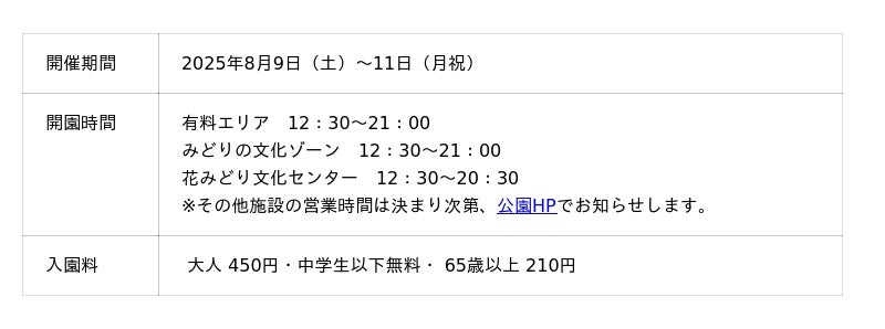 国営昭和記念公園(立川市・昭島市)では、夏の特別夜間開園「ほしぞら散歩」の開催が決定しました。8月9日(土)~11日(月祝)の3日間、普段の開園時間を後ろ倒しして、12:30~21:00まで開園します(通常9:30~18:00)。夜間開園ならではのライトアップや手持ち花火などのイベントを企画しています。
