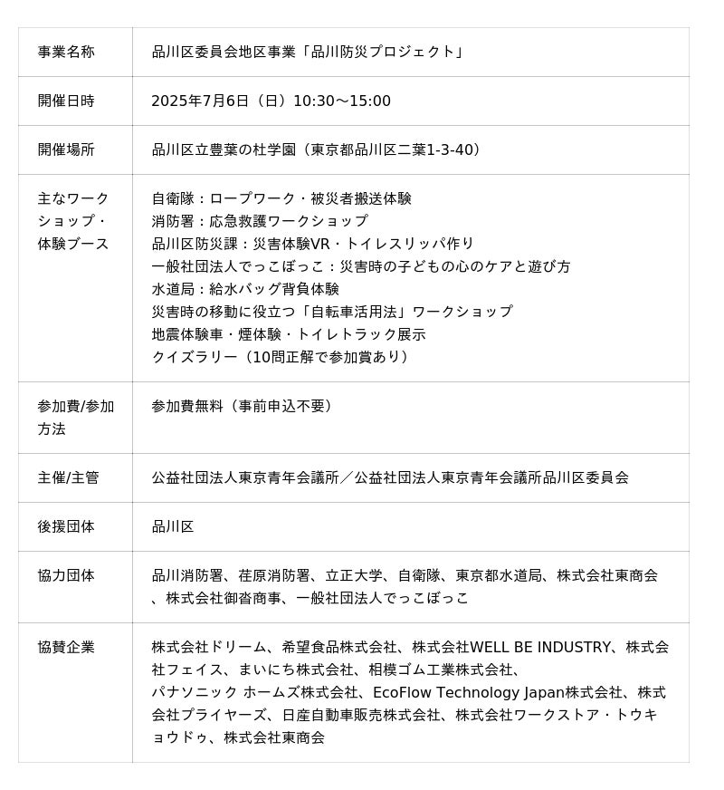 公益社団法人東京青年会議所 品川区委員会では、地区事業として2025年7月6日(日)、防災体験型イベント「品川防災プロジェクトDAY1」を品川区立豊葉の杜学園にて開催します。