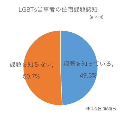 株式会社IRISが2022年に実施した調査(インターネットモニター調査、全国16~64歳までのLGBTs当事者を対象、回答数414件)では、当事者の49.3%が「LGBTsを含むセクシュアルマイノリティが住宅を借りたり買ったりするときに課題がある」ことを知っていると回答しています。