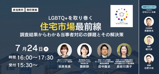住宅みらい会議では、今回の調査結果をもとに記念すべき第1回目のイベントを開催いたします。イベントでは「LGBTQ+を取り巻く住宅市場最前線!」と題し、今回の調査結果をもとに、最新のLGBTQ+を取り巻く住宅状況をパネリストと共に解説し、企業の現状についても深掘りしていきます。