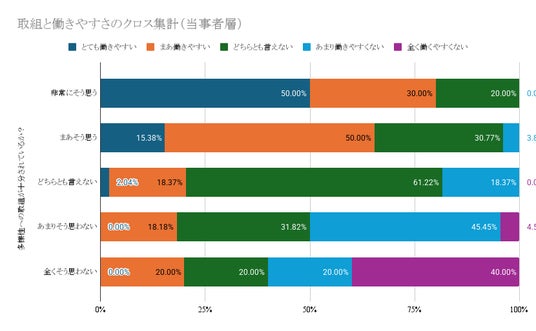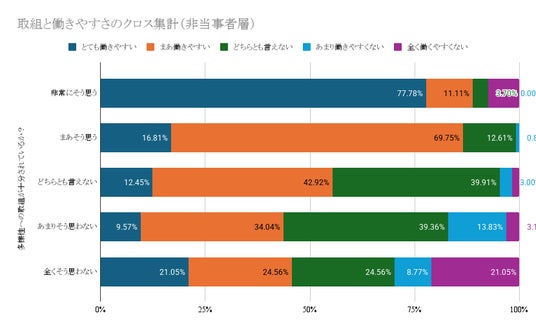 ただし、非当事者層では全く取り組みがなされていない職場で逆に働きやすい割合が増えていたが、同時に働きにくい割合も増えており二極化傾向にあった。