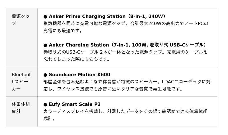 今回展開する「Anker Room」では、心身もお使いの機器も充電できる「RELAX & CHARGE」をコンセプトに、複数機器を急速充電できる充電関連製品から高音質で音楽やエンタメをお楽しみいただけるスピーカー等、Ankerグループの4製品をお部屋にご用意しました。Anker史上最高峰シリーズの高出力電源タップ「Anker Prime Charging Station(8-in-1, 240W)」や巻取り式ケーブル一体型の「Anker Charging Station(7-in-1, 100W, 巻取り式 USB-Cケーブル)」、ハイレゾ音源の再生に対応したBluetoothスピーカー「Soundcore Motion X600」、測定結果をカラーディスプレイで確認できる体重体組成計「Eufy Smart Scale P3」をお使いいただけます。また全ての「Anker Room」は、入り口のドアから壁面、カーテン、ベッド等もAnker仕様のオリジナルデザインを施しています。