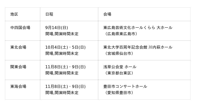 2025年9月からは後半の「秋季会場」が開催。9月14日中四国会場の開催を皮切りに、11月にかけて4会場で演奏を聴く事ができる。整理券の申し込みは8月から順次案内予定。