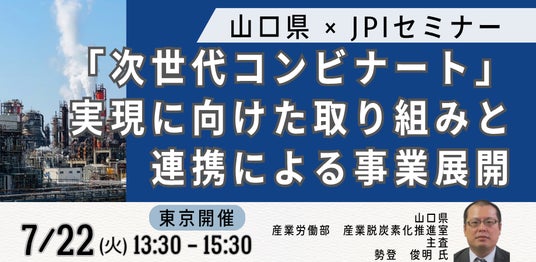 JPI(日本計画研究所)は、山口県 産業労働部 産業脱炭素化推進室 主査 勢登 俊明 氏を招聘し、「次世代コンビナート」実現に向けた取り組みと連携による事業展開について詳説いただくセミナーを開催します。