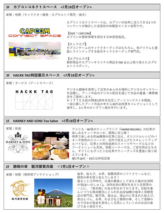 ◎全国初出店のショップ含め、この夏4店舗が新たにオープン!KITTE大阪ではこの夏に4店舗のニューショップがオープンいたします。カプコンの世界に没入できる複合施設「カプコンコネクトベース」、アートスペース「HACKK TAG」など全国初出店の店舗をはじめ、飲食店や静岡県アンテナショップなど個性豊かな新店舗がそろいます。