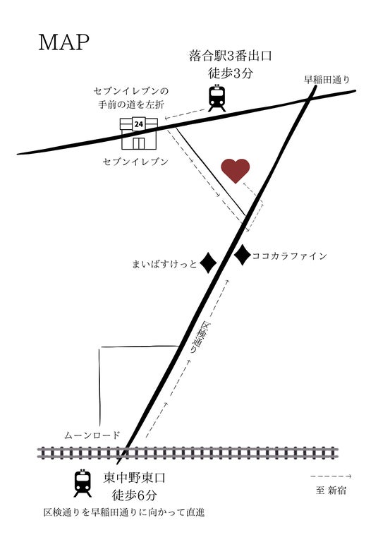 東中野駅東口から徒歩6分、東西線落合駅から徒歩3分、住宅街の一角にひっそりと佇む小さな店です。