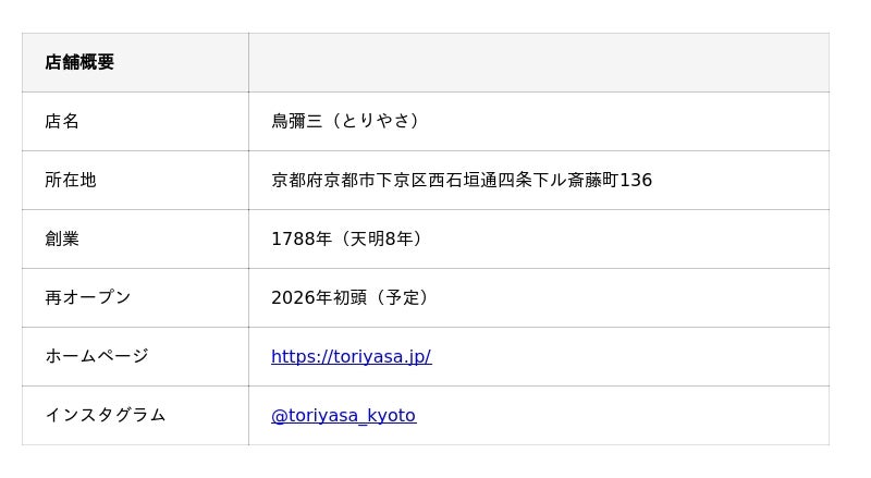 株式会社タイソンズアンドカンパニー(東京都品川区、代表取締役社長寺田心平)は、京都・木屋町で江戸時代から続く水炊き料亭 「鳥彌三(とりやさ)」の経営を引き継ぎ、2026年初頭にリブランディングオープンを目指しています。1788年の創業時から使われてきた代々受け継がれてきた“秘伝の味”を守りながら、現代の感性をさりげなく織り込んだ空間とおもてなしで、より多くの人々に愛される店づくりを進めてまいります。
