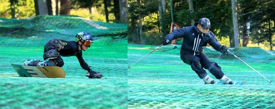 ふじてんリゾートのサマーゲレンデは、「カービングマット」と呼ばれるサマーゲレンデ用に開発された最新スノーマットを使用しています。カービングマットは滑走性とロングターン性能に優れており、スキー・スノーボードどちらも冬の雪上と同じような感覚で滑ることが可能です。さらに、マットの硬さやピンの長さを調節し、スキー板のエッジ(板の両横についている金属部品)がグリップしやすくなるように整備しており、キレの良いターン感覚をお楽しみいただけます。滑走性を高めるためのコースへの散水・ワックスの使用を含め、より良いコンディション作りに努めています。