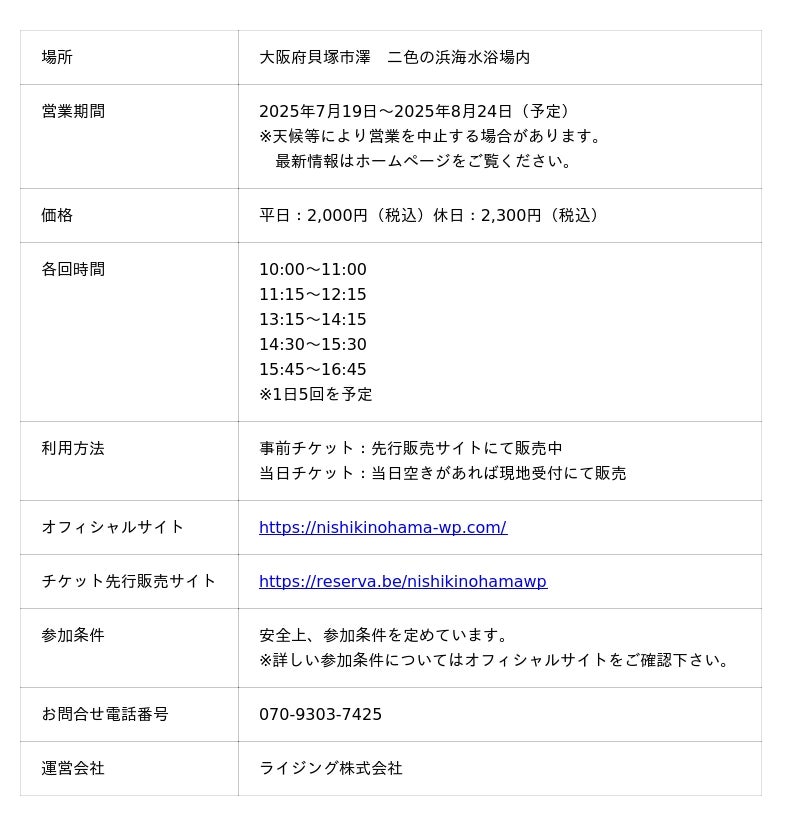 ライジング株式会社(本社:大阪府貝塚市澤665-1 代表取締役 延生 康二)は大阪初の国際環境認証ブルーフラッグを取得した二色の浜海水浴場で二色の浜ウォーターパークを2025年7月19日~2025年8月24日の期間営業致します。