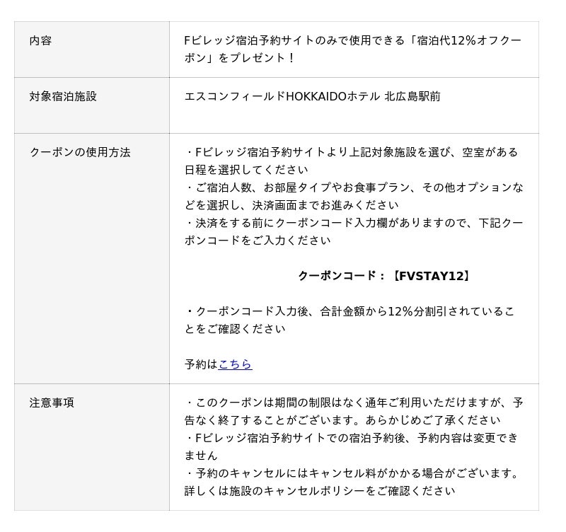 Fビレッジ近郊施設での宿泊が最大12%オフで、お得にご利用いただけます。