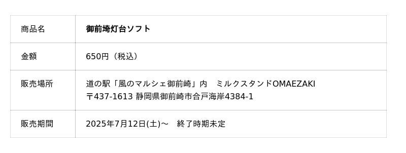 燈の守り人のキャラクター活用権を有する静岡県御前崎市とは、これまで地域活性化を目的として「おしゃべり自動販売機」や「道の駅特別記念きっぷ」など、様々な施策に取り組んできました。そしてこの度、新たなコラボレーションが実現。燈の守り人のキャラクターがデザインされたソフトクリーム「御前埼灯台ソフト」が、2025年7月12日(土)より道の駅「風のマルシェ御前崎」にて発売されます。先着50名様限定でキャラクターデザイン入りシールを1枚プレゼントいたします。