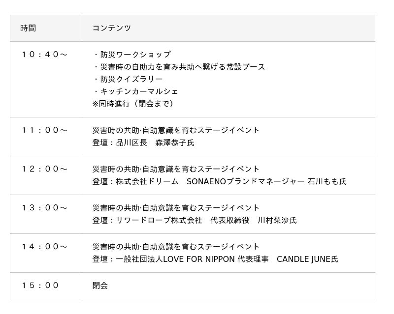 登壇するのは、東日本大震災をはじめとする被災地支援の第一人者・CANDLE JUNE氏、品川区長・森澤恭子氏、日常の延長線にある備え“フェーズフリー”を提唱する石川もも氏(SONAENOブランドマネージャー)、そしてママ目線で実践的な防災知識を発信する川村梨沙氏(リワードローブ代表)といった、豪華かつ実践的なメンバーです。
