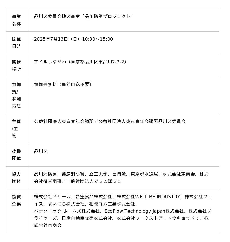 公益社団法人東京青年会議所 品川区委員会では、地区事業として2025年7月13日(日)、防災イベント「品川防災プロジェクトDAY2」をアイルしながわにて開催します。