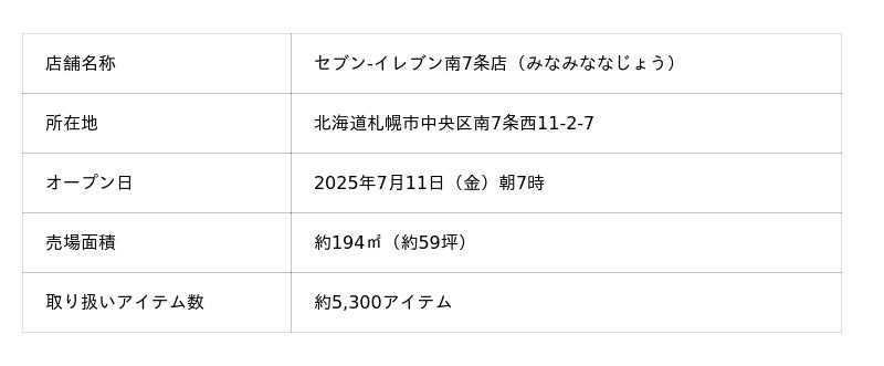 このたび、『北海道プロジェクト』の一環として、「セブン‐イレブン南7条店」が7月11日(金)朝7時にオープンすることとなりました。この店舗では、“地域に求められる品揃え”や“新たな成長戦略”などの実現をコンセプトに、北海道独自の文化や習慣、社会課題に基づいた品揃えや売場を具現化しながら、地域のニーズにお応えするさまざまなテストを行ってまいります。今後、テスト結果の検証も進めながら、異なるエリアや商圏での取り組み拡大も検討してまいります。