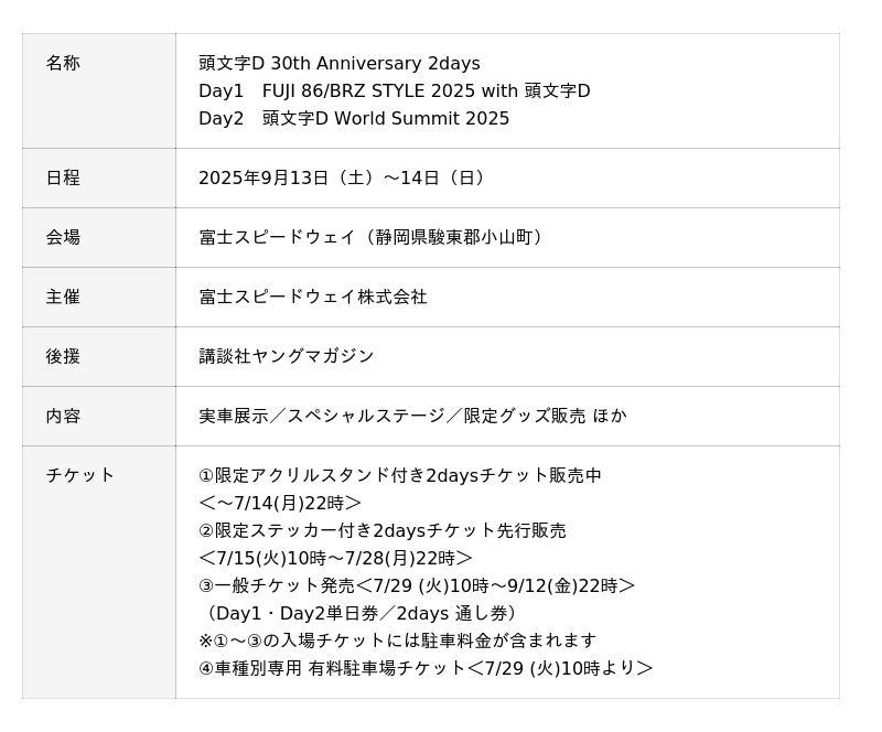 富士スピードウェイ株式会社(本社:静岡県駿東郡小山町)は、講談社の後援のもと、伝説的大ヒット漫画『頭文字D』の連載開始30周年を記念したスペシャルイベント「頭文字D 30th Anniversary 2days」を、2025年9月13日(土)・14日(日)の2日間にわたり開催いたします。