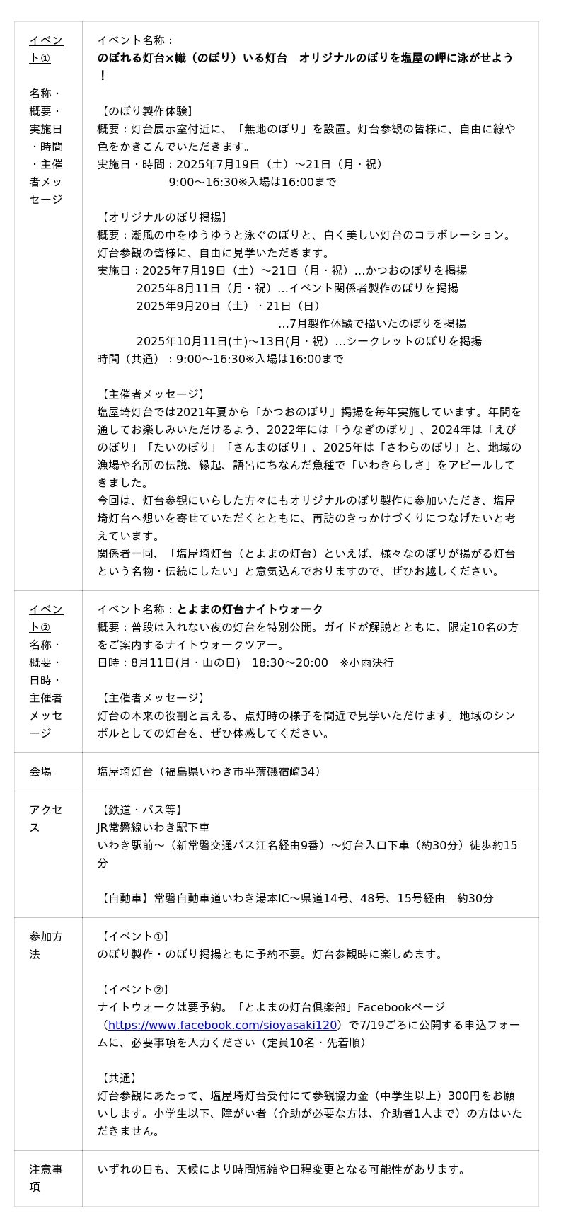 塩屋埼灯台活性化プロジェクト実行委員会は、2025年7月~10月にイベント「のぼれる灯台×幟(のぼり)いる灯台 オリジナルのぼりを塩屋の岬に泳がせよう!」、8月11日に「とよまの灯台ナイトウォーク」を開催いたします。塩屋埼灯台に登ったことがない方はこの機会に、登ったことがあるという方も前回とはちょっと違う灯台を見に、ぜひご参加ください。