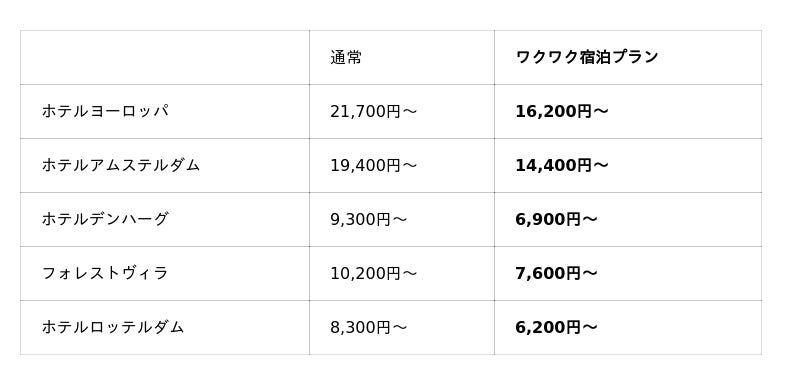 【対象ホテル】ホテルヨーロッパ、ホテルアムステルダム、ホテルデンハーグ、フォレストヴィラ、ホテルロッテルダム