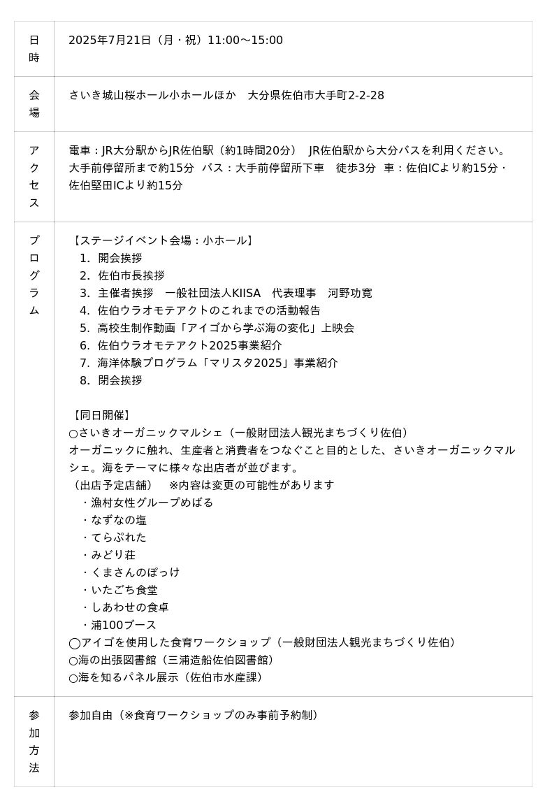 一般社団法人KIISAは、2025年7月21日(月・祝)海の日に「佐伯ウラオモテアクト キックオフイベント2025」をさいき城山桜ホールにて開催いたします。3年目となる佐伯ウラオモテアクトの2025年度事業のご紹介をはじめ、昨年度高校生が制作した海を知る動画の上映会や、大学生との企画構築を行う海洋体験プログラム(マリスタ2025)の事業紹介などを行います。当日はさいきオーガニックマルシェや食育ワークショップ等も同日開催されます。このイベントは、次世代へ豊かで美しい海を引き継ぐために、海を介して人と人とがつながる“日本財団「海と日本プロジェクト」”の一環です。