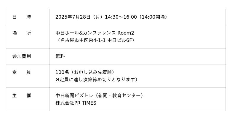 中日新聞社が運営する人材研修サービス「中日ビズトレ」は、プレスリリース配信サービスのPR TIMESと共催で、「地域も会社も元気にする広報」と題したセミナーを、2025年7月28日(月)に名古屋・栄の中日ビル6F 中日ホール&カンファレンスで開催いたします。