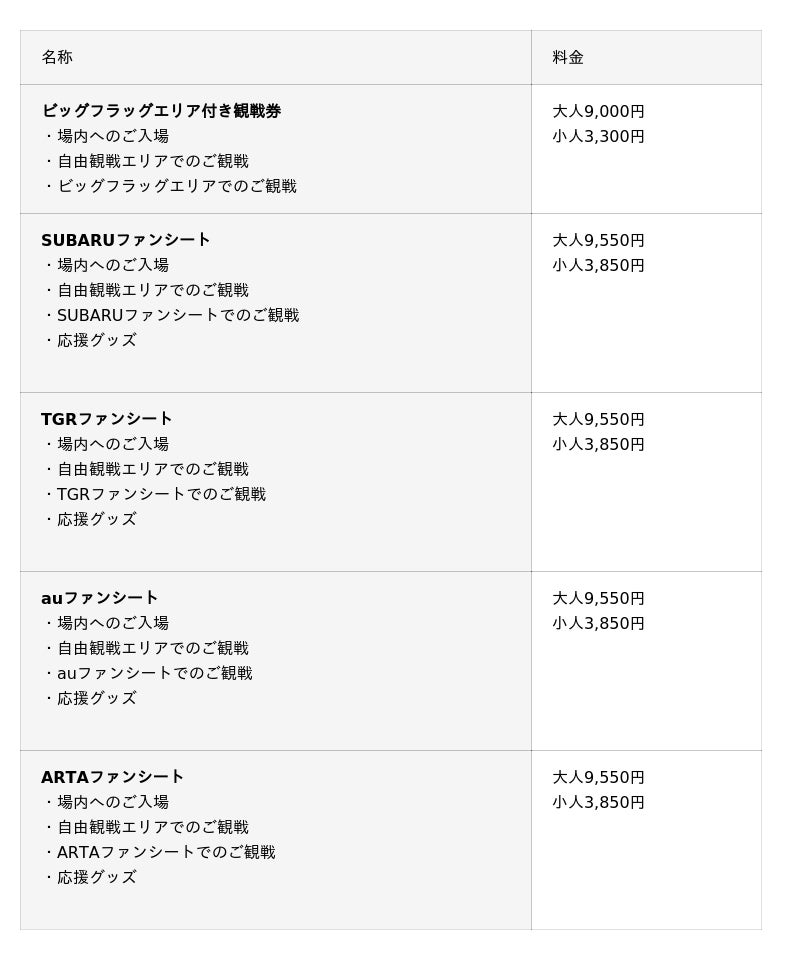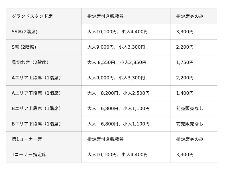 ※グランドスタンドエリアおよび第1コーナースタンド席には別途ファンシート/指定席券などをご購入下さい。