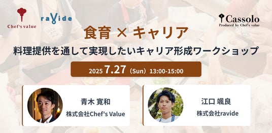 プロフェッショナル・エージェンシー事業を展開する株式会社クリーク・アンド・リバー社(以下C&R社)の食分野の子会社である株式会社Chef‘s value (以下CV)は7月27日(日)、現役の料理人や飲食店経営者などの食のプロフェッショナルの方々を対象としたイベント「食育×キャリア 料理提供を通して実現したいキャリア形成 ワークショップ」をCVが運営するレストラン「Cassolo」(東京・虎ノ門)で開催いたします。なお、本イベントでは、食育活動や食関連のイベント等を展開する株式会社ravide代表取締役の江口 颯良氏をゲストにお招きし、「食育×キャリア」をテーマとした講義、ワークショップ、対談、交流会を予定しております。