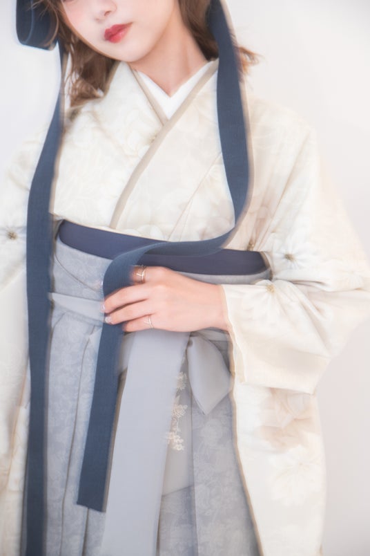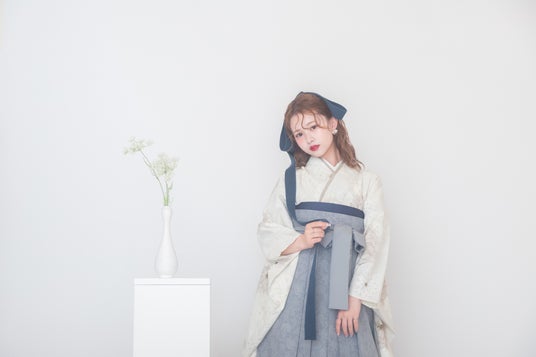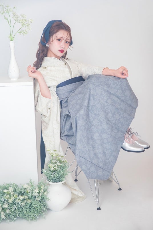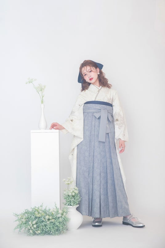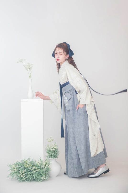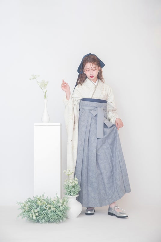 オフホワイトの柔らかな着物に、インディゴブルーとライトグレーの袴を合わせることで、全体的に落ち着いたトーンながらも、深みとメリハリが生まれ、基調色とアクセントカラーのバランスがポイント。カラーパレットから洗練性を感じるスタイリングです。