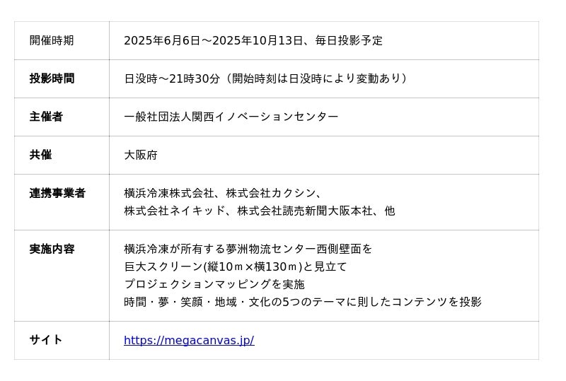 株式会社カクシン(本社:東京都港区、代表取締役:太田 高揚)が株式会社NAKEDと協働でプロデュースしている夢洲での大規模プロジェクションマッピング「MEGA CANVAS(メガキャンバス)」において、様々な企業・個人にご協賛いただき、企業ロゴや記念メッセージを投影する「ツナグ-キャンバス」プロジェクトを、7月10日よりスタートしました。