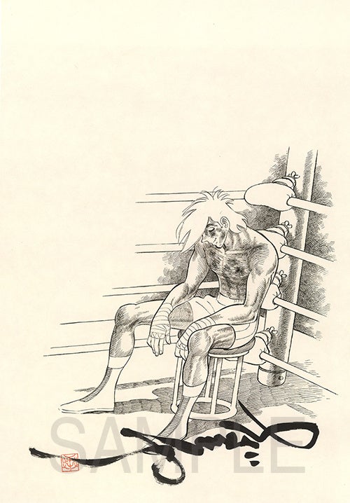 新作「まっ白な灰に…(和紙Ver)」は、千年以上の耐久性をもつ越前和紙に高精細複製技術エゾグラフで刷り上げた限定300部のプレミアム作品です。ちばてつや氏が一本一本毛筆でサインを入れるため、同じものが二つとない特別な一枚となります。額装はシャンパンカラーで、作品のモノトーン表現と調和。主人公である、矢吹丈の精神を和紙ならではの質感で味わえる点が最大の魅力です。漫画原画の劣化が進み、文化的な価値のあるものが失われていく事に危機感を感じていたちばてつや氏が、日本の伝統文化である越前和紙もまた技術継承の危機に面していると聞き、『和紙と漫画』の文化と保存を考える会」に賛同したことをきっかけに作品が生まれました。
