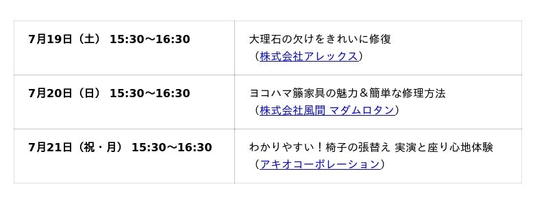 - アキオコーポレーション (Instagram @akio_corp)・匠と作る、私だけの折りたたみ正座椅子 (参加費:4500円)・踏み台×座面張り体験。暮らしに“座れる”をプラス (参加費:1500円)・親子で楽しむ!革の三つ編みコードホルダーづくり(参加費:500円)