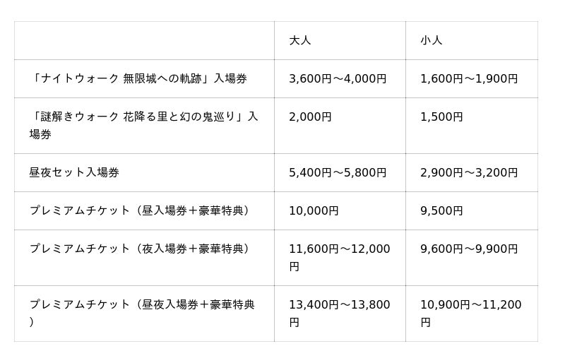 ※「ナイトウォーク 無限城への軌跡」については4歳以下無料。「謎解きウォーク 花降る里と幻の鬼巡り」に参加するには購入が必要となります