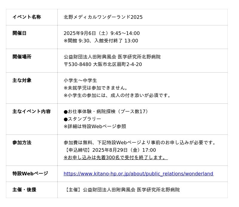 公益財団法人田附興風会 医学研究所北野病院(大阪市北区、理事長:稲垣暢也)は、未来ある子どもたちに少しでも医療や病院のことを知ってもらい、将来医療従事者をめざしてもらうことを目的に、2025年9月6日(土)、医療のお仕事体験や病院探検ができるイベント「北野メディカルワンダーランド2025」を開催します。対象者は、病院や医療の仕事に興味のある小・中学生の皆さん、参加費は無料です。