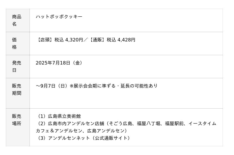 広島県立美術館での会期終了後も、全国巡回展の各会場で、順次「ハットポッポクッキー」を販売いたします。