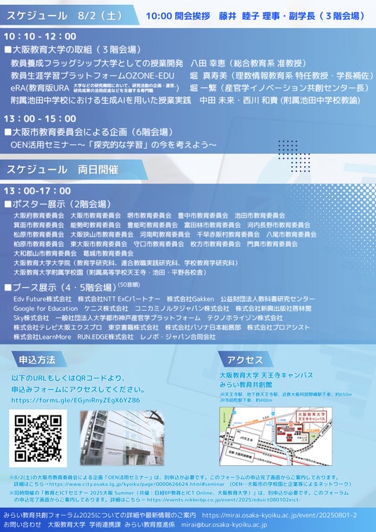 本フォーラムでは、大阪府教育委員会教育長と本学副学長(みらい教育共創拠点長)による基調講演をはじめ、本学の産官学連携における取組発表や、包括連携協定を締結している教育委員会・本学大学院・附属学校園によるポスター展示、企業によるブース展示等を行います。