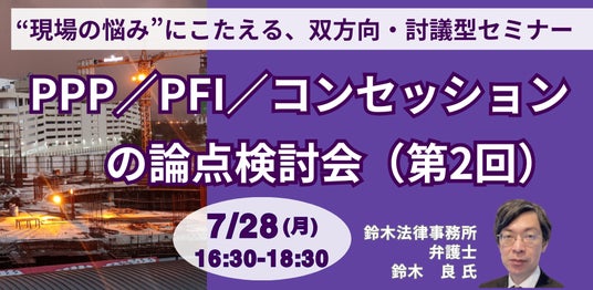 平成11(1999)年にPFI法が制定されて以降現在に至るまで、PPP/PFI/コンセッションの事業数は順調に増加しており、それとともにPPP/PFI/コンセッションに関わるプレーヤーの裾野も広がっています。他方、各プレーヤーは、それぞれ個別の案件に従事する中で、様々な実務上の疑問点に日々直面しているものと推測されます。そこで、本セミナーでは、PPP/PFI/コンセッションに従事する参加者が、実際の案件において遭遇した実務上の疑問点を持ち寄り、講師と参加者、あるいは参加者同士による双方向型での自由闊達な議論を通じてこれを解消するとともに、個社の枠を越えた業界全体の情報交換や仲間作りを促進いたします。