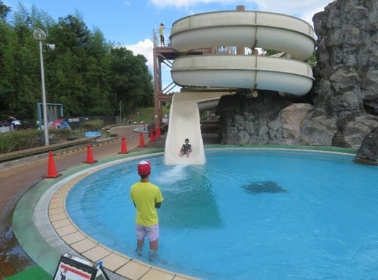 百目木公園プールには、大自然をイメージした修景プールや、スピード感あふれる全長50mの大型スライダーがあり、子供から大人まで楽しめる施設です。