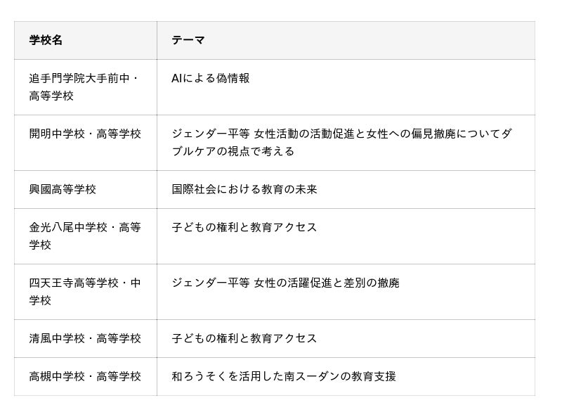 午後の部では、全国7校から選ばれた高校生が、6ヶ月間にわたり探究したテーマ(教育格差、ジェンダー、AIと情報、人権と医療など)について発表します。