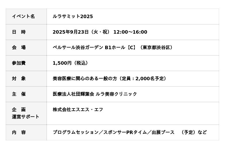 ルラ美容クリニックからの感謝の気持ちを込めて、美容医療の“リアル”を見て、聞いて、体験できる体験型美容医療イベント「ルラサミット2025」を、2025年9月23日(火・祝)にベルサール渋谷ガーデンにて最大規模2000人規模にて開催いたします。