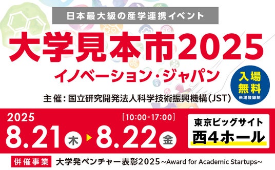 併催事業「大学発ベンチャー表彰2025」最終ノミネート企業発表速報掲載!併催事業である「大学発ベンチャー表彰2025」~Award for Academic Startups~の最終ノミネート企業が発表されました。大学見本市2025公式サイトに速報を掲載しています。