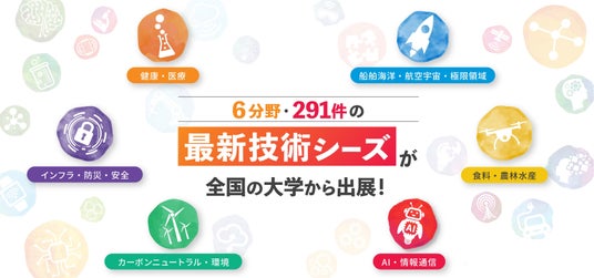 大学等シーズ展示 6分野:カーボンニュートラル・環境/健康・医療/食料・農林水産/船舶海洋・航空宇宙・極限領域/AI・情報通信/インフラ・防災・安全
