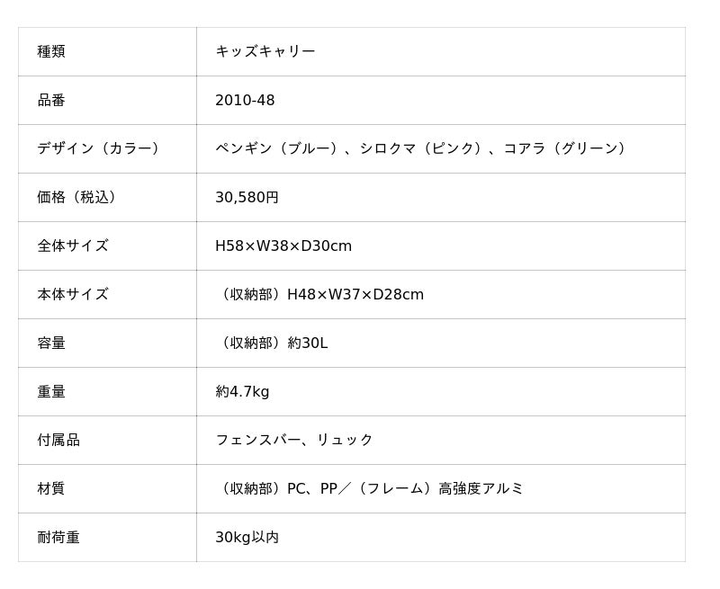 製品サイズは1サイズで、デザインは「ペンギン」「シロクマ」「コアラ」の3種類。価格はキッズキャリーとリュックのセットで30,580円(税込)です。