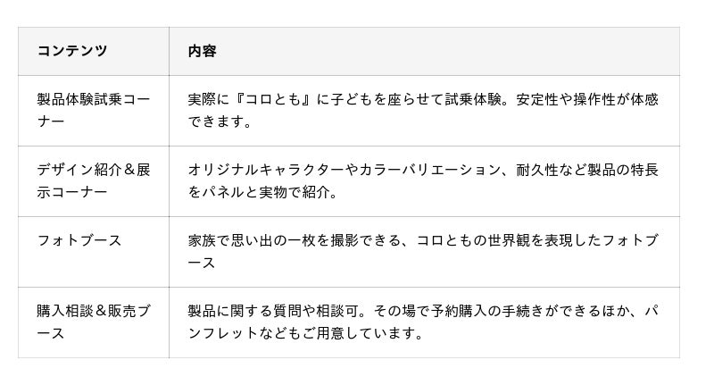発売に先立ち、2025年7月26日(土)・27日(日)の2日間、イオンレイクタウンmori「花の広場」にて、『コロとも』の体験イベントを開催します。会場では実際の製品に子どもを乗せて試乗ができるほか、デザイン・耐久性などのこだわりに関する展示、『コロとも』と一緒に家族で“映え”写真が撮影できるフォトブースなど、親子で楽しめるコンテンツも。『コロとも』の魅力を実際に見て体感いただける絶好の機会です。購入相談や、当日限定の販売特典もご用意しています。<開催概要>