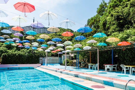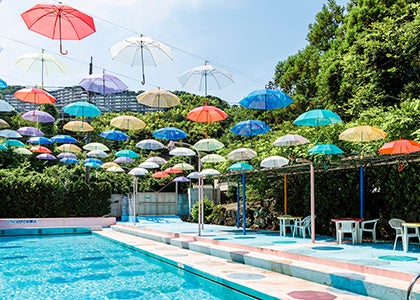 2つ目は、夏の期間限定で利用できる伊東小涌園の屋外プールが無料でご利用いただけます。プールの上には、カラフルなアンブレラスカイが広がり、まるで異国の地にいるかのような非日常の風景が楽しめます。