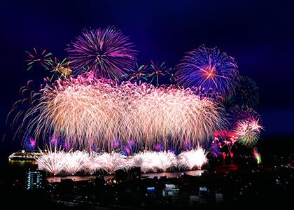 7月から8月にかけて開催される本花火大会は、伊東の夏を象徴する1つ。期間中は14回もの打ち上げがあり、夏旅には欠かせない一つとなるでしょう。中でも8月10日開催の「按針祭海の花火大会」は 要注目!!按針祭のフィナーレを飾るメインイベントとなり、海上5ヶ所から打ち上がる約1万発の花火は圧巻。オレンジビーチからの鑑賞もおすすめです。