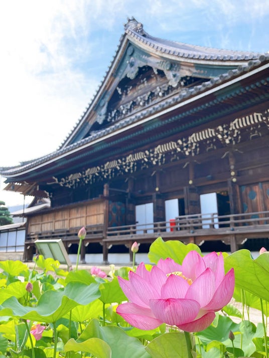 大谷本廟の入り口にある「めがね橋」の下にある池、また仏殿の横には蓮の花が咲いています。こちらは「大賀蓮(オオガハス)」という種類で、例年7月から8月上旬ごろが見頃です。