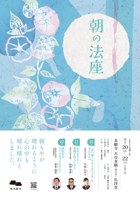 朝の法座では、3日間で浄土真宗の僧侶だけではなく、他宗派の僧侶や専門の講師を招き、幅広い分野の話を聴くことができます。早朝のさわやかな空気の中、仏さまと向き合うひとときを過ごしてみてはいかがでしょうか。