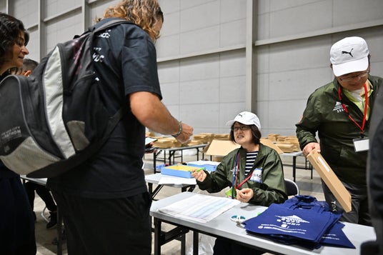 (2)ボランティア体験(アスリートビブス等を受け取りに来ているランナー対応)