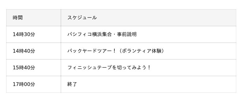 これは、本大会の開催趣旨である、「する、みる、ささえる」すべての人が楽しめる大会を体感していただくために、「する」=フィニッシュ体験、「みる」=仲間の応援、「ささえる」=バックヤードツアー(ボランティア体験)を、横浜マラソン前日の1日で体験することができる、ファミリー向けの企画となっています。