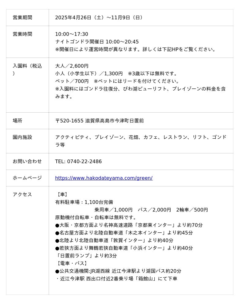 <【びわこ箱館山】グリーンシーズン 開催概要>