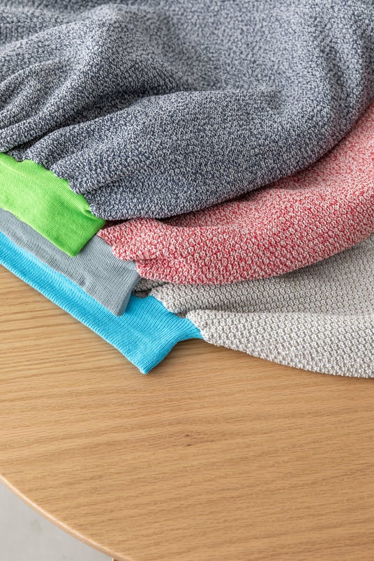 カラーは、ネイビー、レッド、ベージュの全3色展開。それぞれ、異なる3種類の糸を撚り合わせた杢糸(もくいと)を使用し、奥行きのある色味を表現しています。ネイビーは「濃紺・濃いグレー・薄いグレー」、レッドは「赤・白・ピンク」、ベージュは「白・淡いベージュ・茶色」の糸を組み合わせ、撚ることで糸に強度が加わり、色のまだら模様が豊かな表情を生み出します。また、ソファにカバーリングした際には見えなくなる裾のゴム糸にも、さりげないカラーアクセントを添えています。