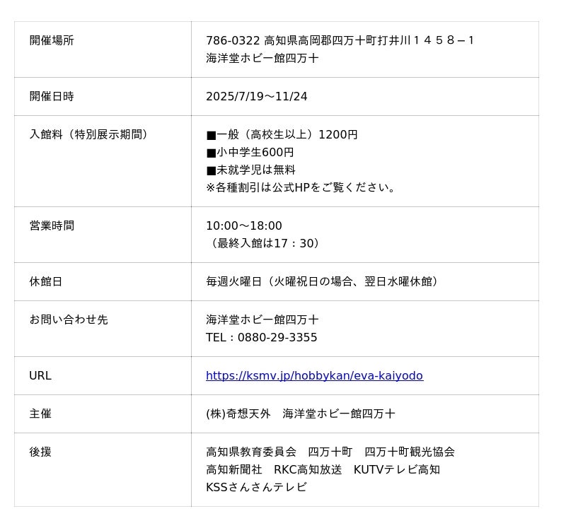 2025.7.19(土)~2025.11.24(月・祝)の期間、主催(株)奇想天外・海洋堂ホビー館四万十にて、エヴァンゲリオン30周年記念特別展『海洋堂エヴァンゲリオンフィギュア展III』ありがとう、全てのエヴァンゲリオン。を高知県四万十町の山奥にある海洋堂フィギュアのミュージアム海洋堂ホビー館四万十で開催します。